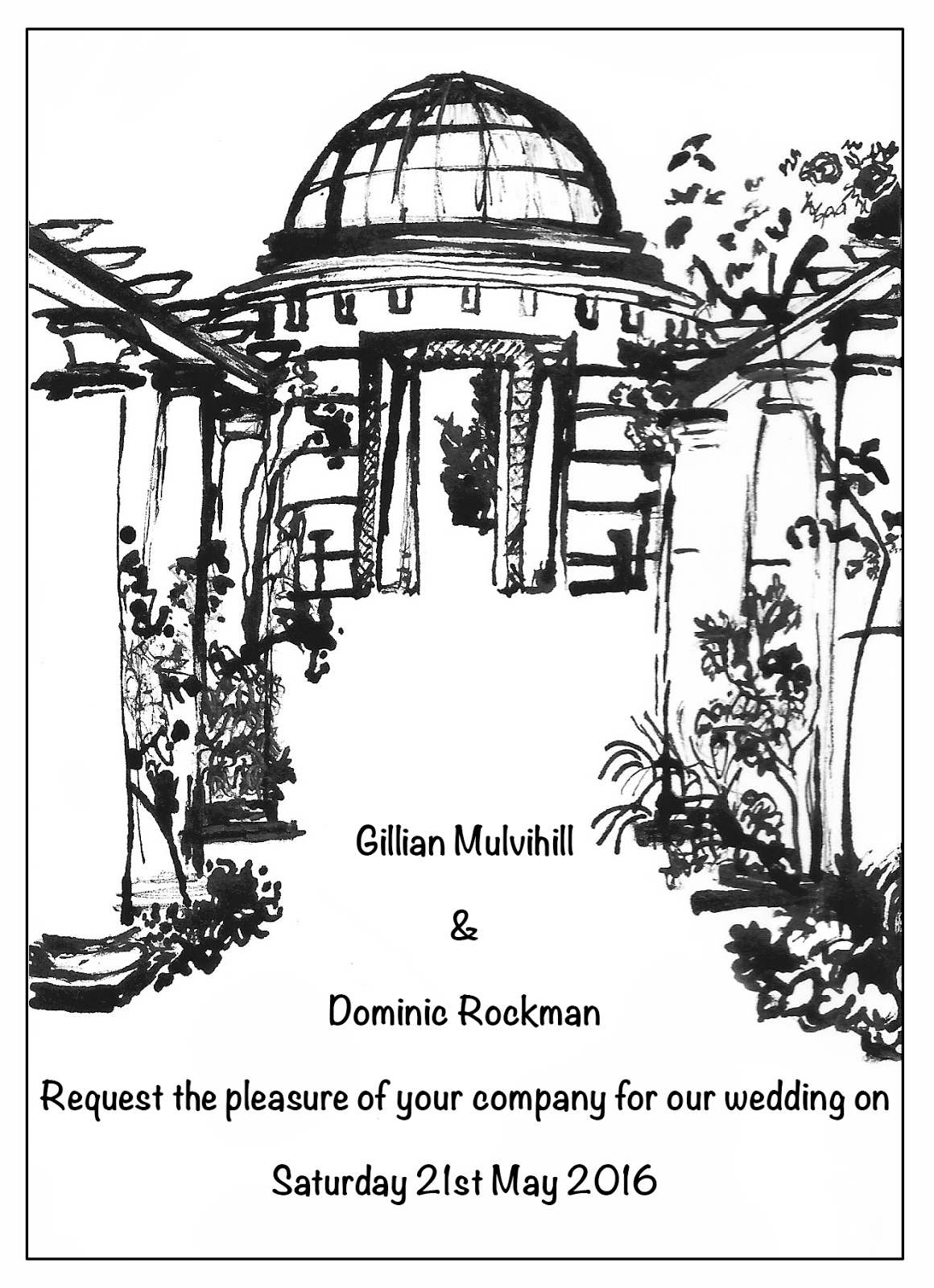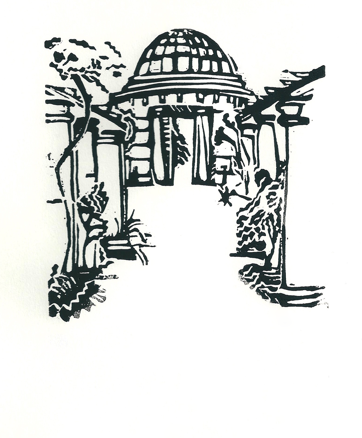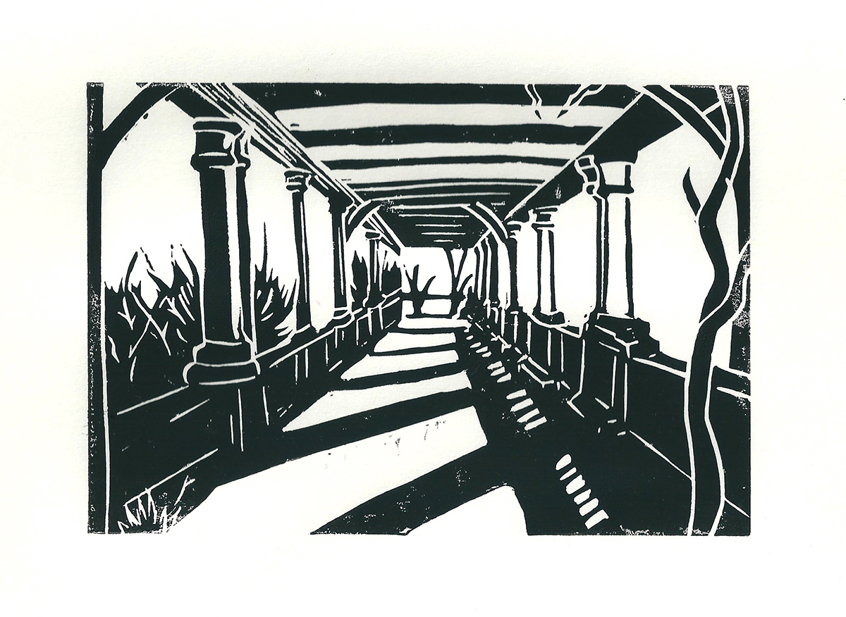 I was commissioned to illustrate wedding invitations with a drawing of the wedding venue; the Hampstead Heath pergola. I was then commissioned by a seperate person to create three linocuts of the same venue.